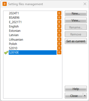 Note: Changing the setting file does not automatically affect the drawing. If you want to update the drawing according to the current setting file, close setting file management by selecting Close and update drawing, or use the separate update functions.