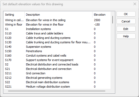 With this function, you can set default elevation values for certain systems in the drawing. These changes only affect objects that you place on the drawing after you have defined the default elevations. The changes do not affect the symbols which are already placed on the drawing. These changes affect only the open drawing, so you have to define the default values separately for other drawings.