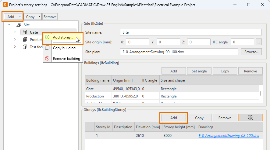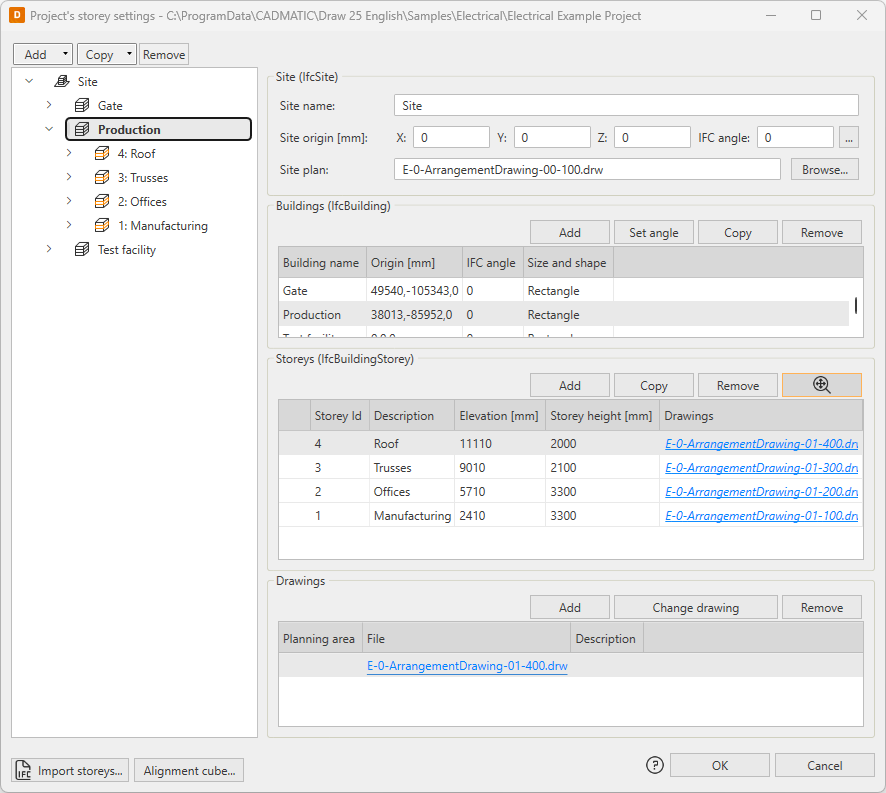 If there is more than one storey in a building, the drawings for each storey are defined in the storey settings. In addition, storey data is stored in the settings. The storey settings also affect drawing wirings and cableways from one storey to another,