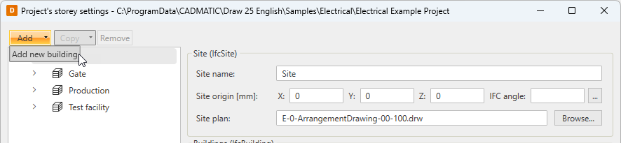 The storey settings can include multiple buildings. Name, origin, IFC angle, and informal shape and size can be defined to each building.