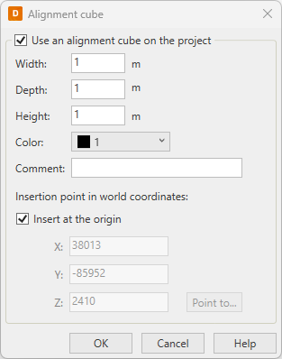 You can define the size, color and comment for the alignment cube. The insertion point is always in world coordinates, and it can be the origin, defined with coordinates, or picked from the drawing.
