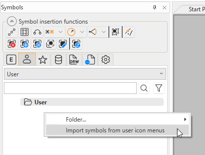 (User's symbols) tab. The symbols you create and save with the Save user symbol function are available on this tab, in addition to which you can import your previously created symbols from the icon menus to the Symbols window by right-clicking in the field and selecting Import symbols from user icon menus: