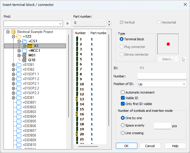 - Automatic increment – If you select to insert terminal blocks one by one, you can decide whether to use incremental numbering. If you do not select this, you will be asked to define the number separately for each terminal block. When terminal blocks are inserted evenly or with line crossing, incremental numbering is used automatically.