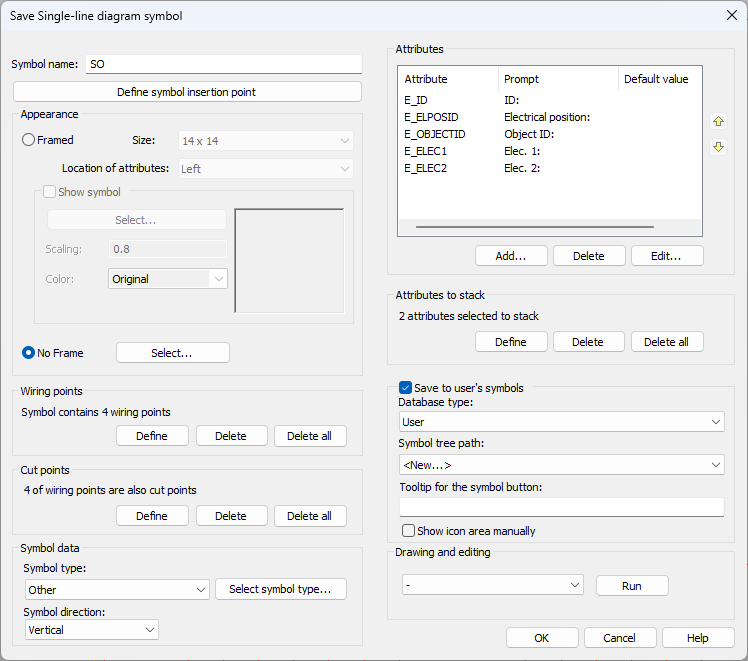 With this function, you can create your own single-line symbols by exploding an existing symbol to be used as the base. This is also an easy way to get several attributes in your symbol. You can copy or edit the attributes as needed.