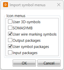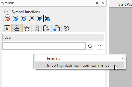 (User's symbols) tab. The symbols you create and save with the Save user symbol function are available on this tab, in addition to which you can import your previously created symbols from the icon menus to the Symbols window by right-clicking in the field and selecting Import symbols from user icon menus: