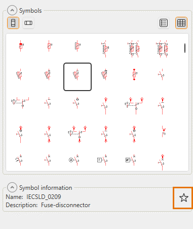 When you select a symbol, its name and description (in the language defined in Electrical settings) are shown in the Symbol information section. You can then add the symbol to your favorites by clicking the