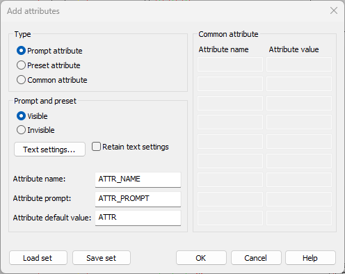 Retain text settings – The text settings defined in the dialog will remain current. Otherwise, the original settings are restored after the attributes have been inserted.