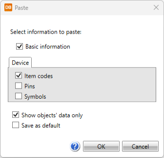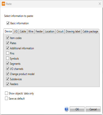You can define the defaults for pasting in the Electrical settings: Select Electrical tab > Settings group > Electrical. In the Electrical settings dialog, on the General tab next to the Edit attributes after copy-paste option, click Settings. The Paste dialog opens. By default, all information is selected. Click the check boxes for the information you do not want to be selected by default when copying objects.