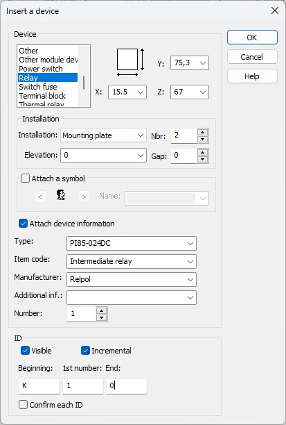 The device information can also be attached to the symbol which allows you to create a parts list of the typified devices in the drawing. If necessary, the parts list can be imported to a file and to the clipboard (can be pasted to e.g. Excel). Device information can also be defined at a later stage.