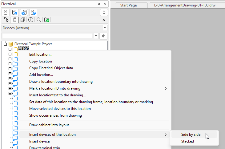 In the project tree, select a location whose devices you want to insert in the drawing.