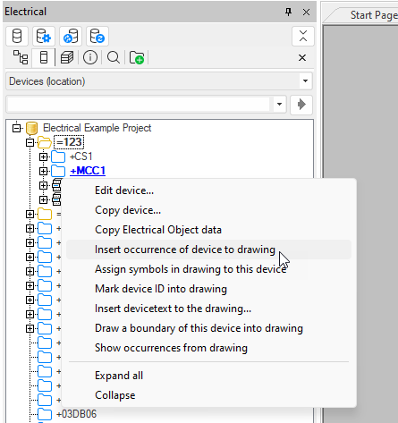 In the project tree, right-click the device you want to insert in the drawing, and select Insert occurrence of device to drawing.