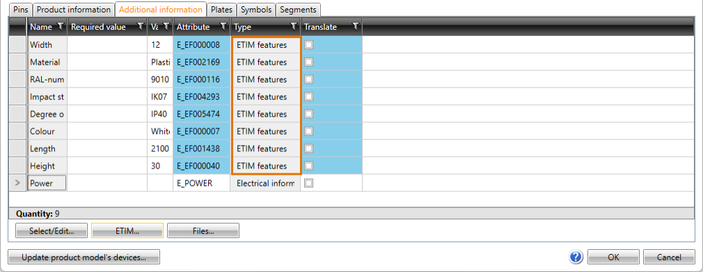 ETIM (European Technical Information Model) is a way of classifying and informing product's technical information in a unified way. With ETIM data, you can define technical details or requirements that must be met when selecting products.