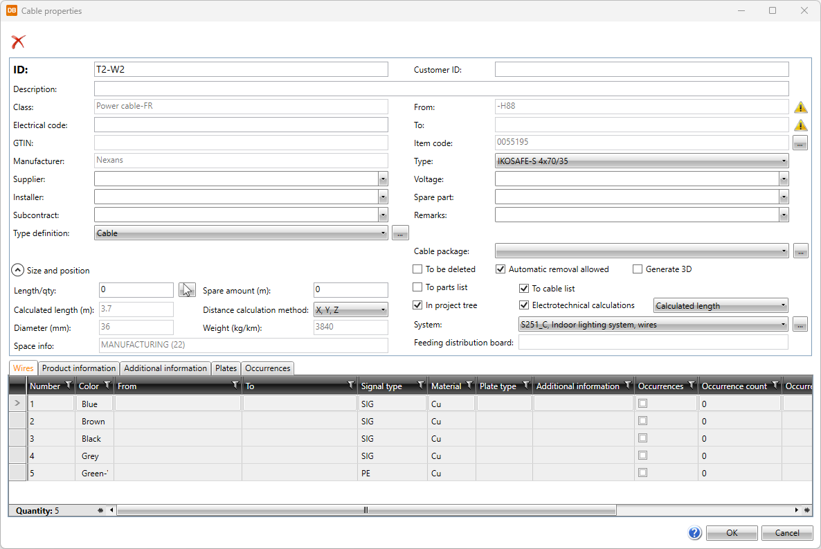 For more information on the Cable properties dialog, see Edit cables and cable packages.