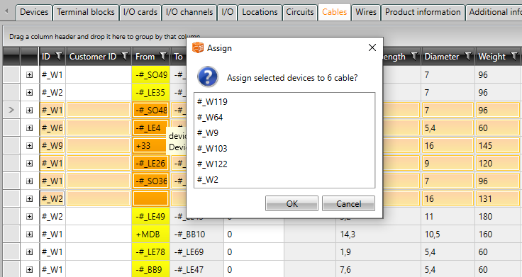 Drop the information. If you selected several cables, the Assign dialog opens.