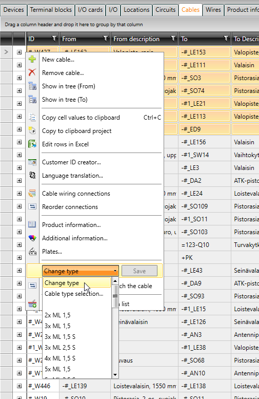 Change cable type by selecting the desired cables, right-clicking and selecting Change type. The list shows cable types currently in the project. If you want to select from all the cable types in the database, select Cable type selection.