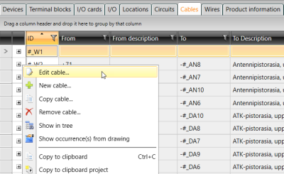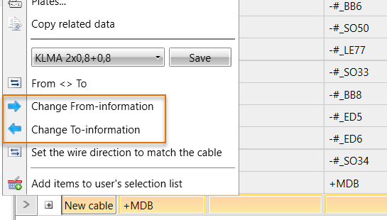Change the From and To information by selecting the desired cables, right-clicking and selecting Change From-information or Change To-information. Editing is possible when there are no occurrences that impact the From/To data.