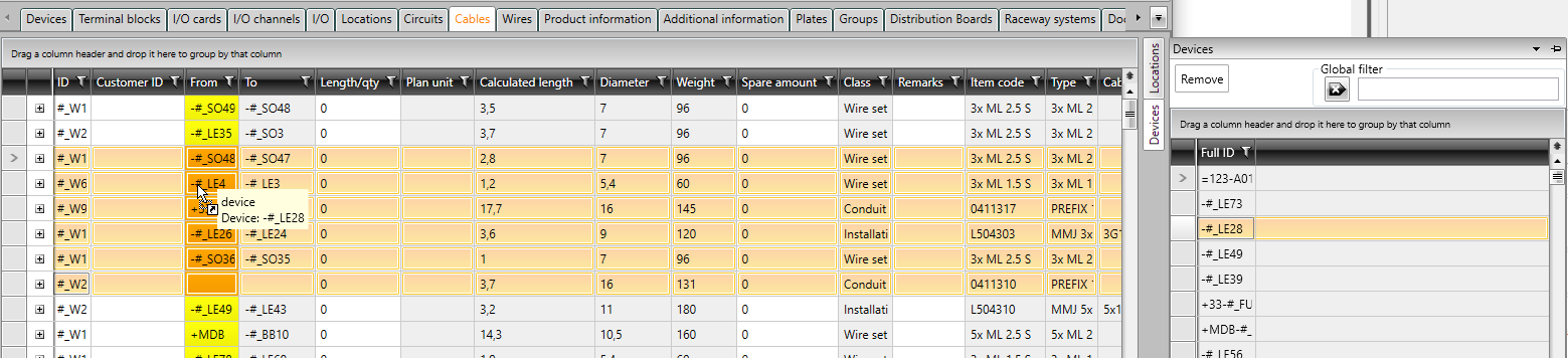 There are two auxiliary grids on the Cables tab on the right: Devices and Locations. You can easily define the From and To information for cables as a mass by dragging and dropping information from the auxiliary grids to the main grid.
