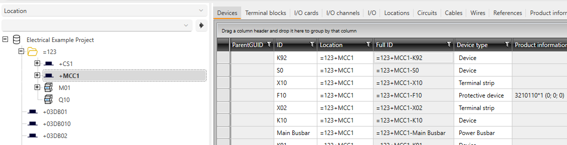 The Devices tab shows the project's devices grouped according to the location selected from the project tree view, for example.