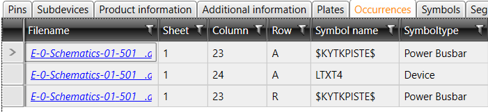 In the Device properties dialog, the Occurrences tab shows occurrences of the device, i.e. in which drawings the device has been used.