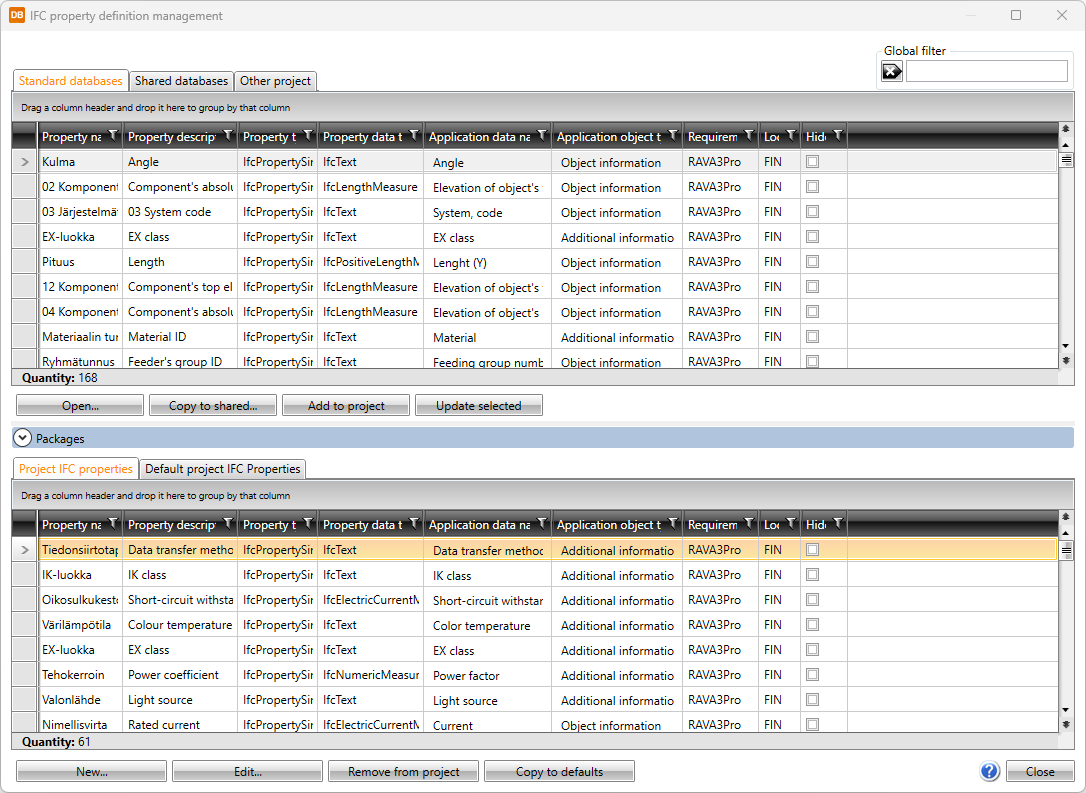 - Standard databases holds the default property definitions provided with the application which will be overwritten whenever the application is updated. You can copy property definitions from this tab to your own shared databases.