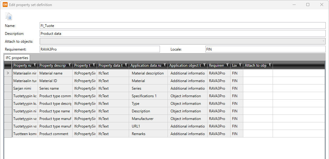 A property set includes the properties you have defined. The property set combines all the necessary properties in one definition which makes it easier to gather all the data you need for objects. When you add a property set to the project, all the properties included in the set are also added.