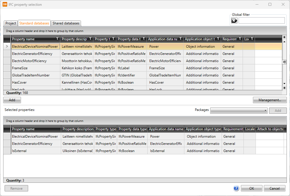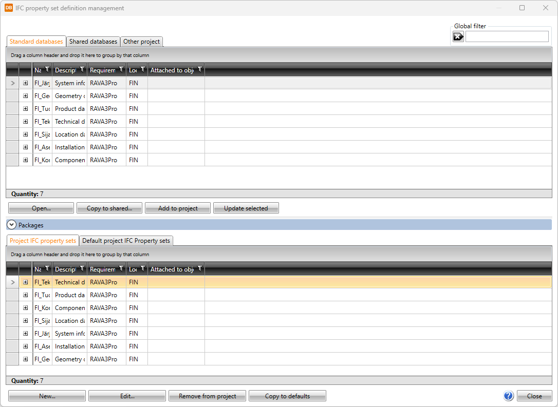 - Standard databases holds the default property sets provided with the application which will be overwritten whenever the application is updated. You can copy property sets from this tab to your own shared databases.