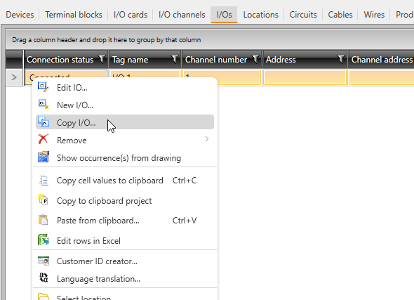 The I/Os tab shows all the I/Os in the project. On this tab, you can add, edit, copy and view them. To see the functions, right-click on the desired cell or the selected row: