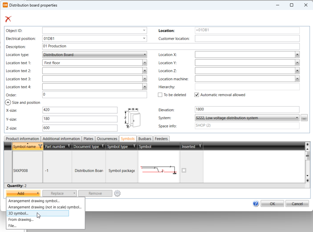On the Symbols tab, all the symbols in the location are shown. When you open the property dialog from the drawing and the location type is Distribution Board, you can also select symbols by clicking Select: