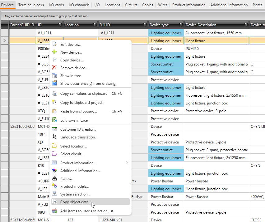 With the Copy object data and Paste object data functions, you can copy and paste object data (such as product information, additional information or plates) from one device, location, circuit, I/O, or cable to another.