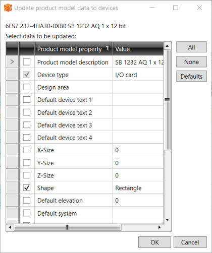 Click OK. If you selected to change the target device product model and the product model is not set to be automatically updated, the Update product model data to devices dialog opens and you can select the data to update.