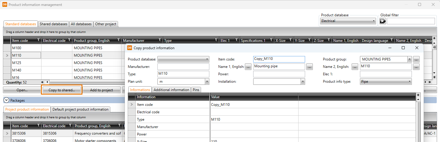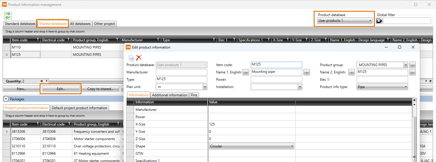 The product databases supplied with the program cannot be edited, but product information can be copied into your own product database with Copy to shared. You can edit the information in connection with copying, or later as necessary.