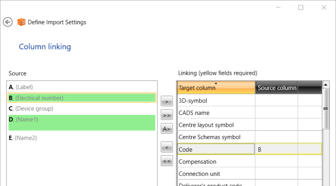 - You can link columns one by one by first selecting the source column, then the target column and then clicking the arrow button pointing right.