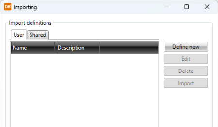 The product information import function allows importing different types of information to the project or product databases by using import definitions. The import definitions you have added yourself are shown on the User tab, and you can use them to easily re-import the same piece of information.