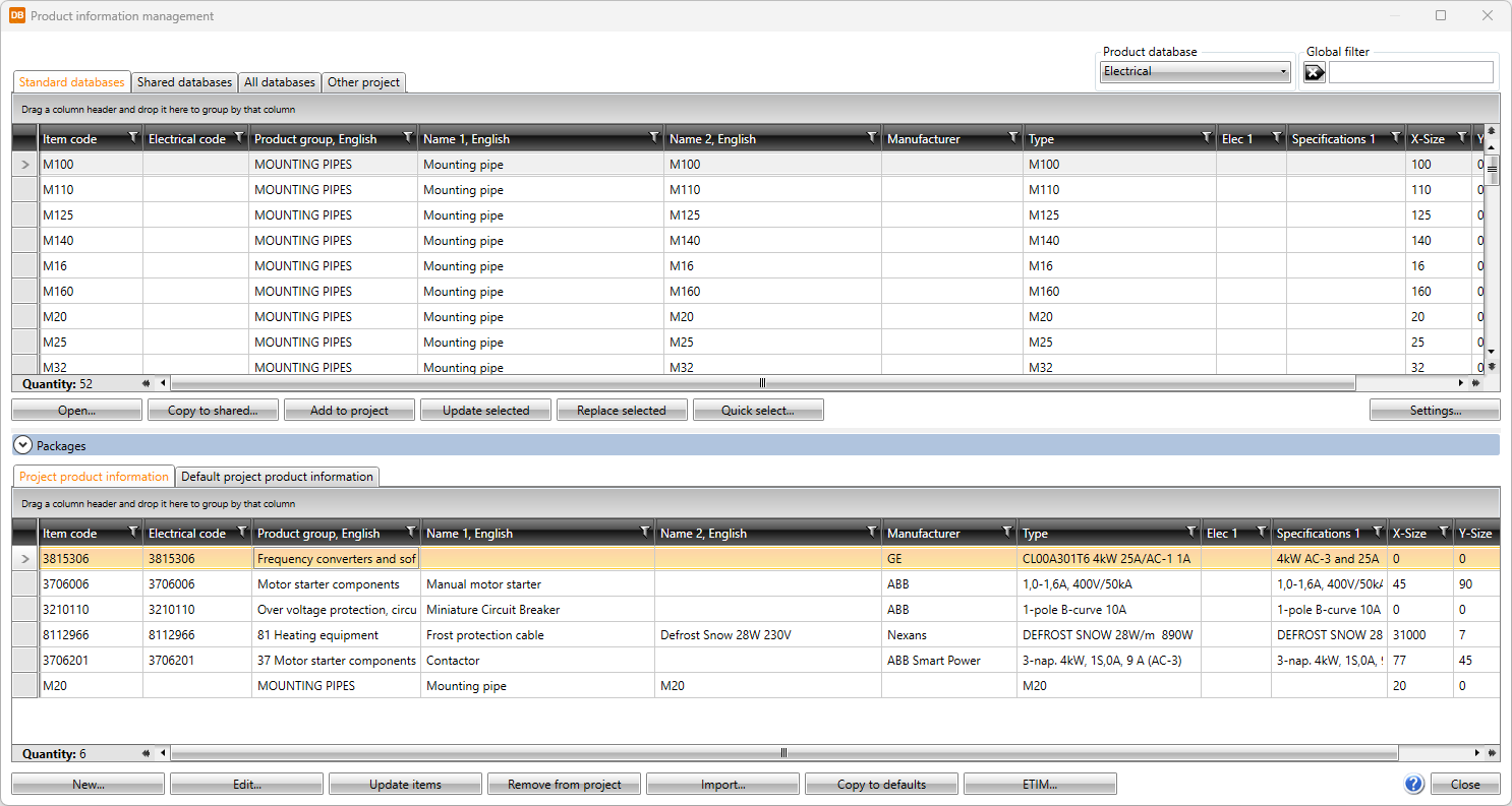 - The Standard databases tab shows the read-only product database (EDBCommon.sqlite) provided with the application. It will be overwritten whenever the application is updated. You can copy product information from this database to your own shared databases.