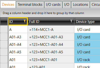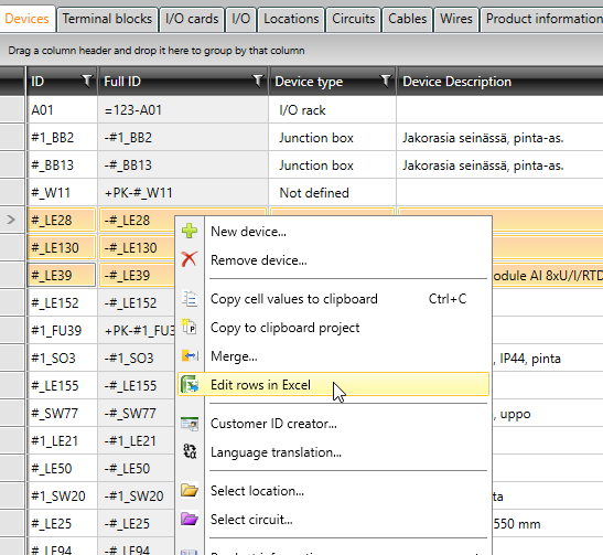 With the Edit rows in Excel function, you can edit project information in an Excel file and then import the new values to Electrical DB Tool.