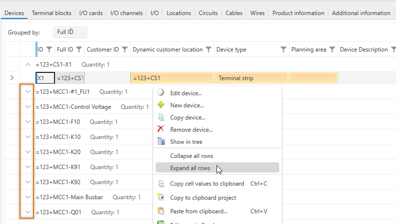 Expand all rows is available in the right-click menu when at least one collapsed group is shown in the grid:
