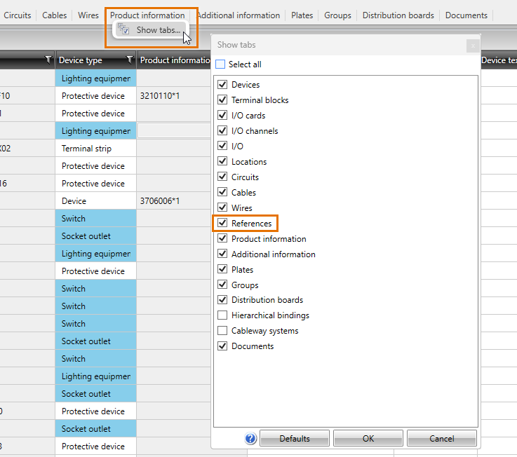 Project information is shown in grids on separate tabs. You can select which tabs are shown by right-clicking and selecting Show tabs. The References tab, for example, is hidden by default but you can select to show it in the Show tabs dialog: