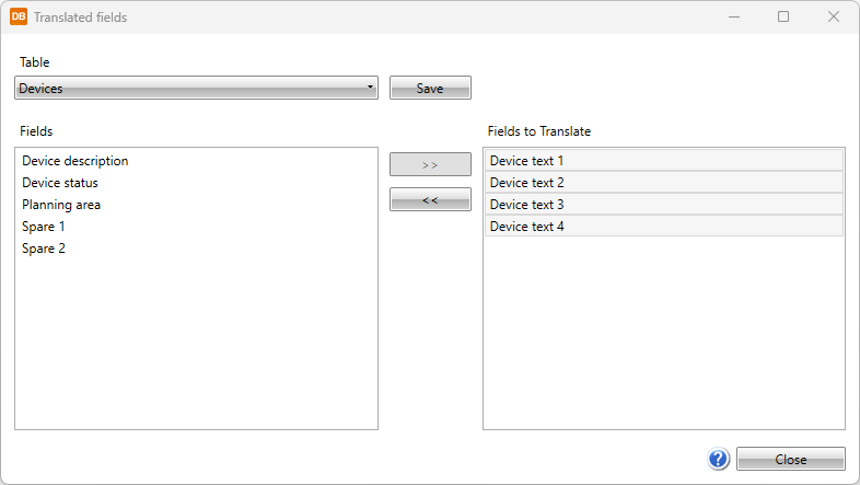 With this function, you can define which fields in the selected table (such as Devices) are translated in order to create reports in various languages.