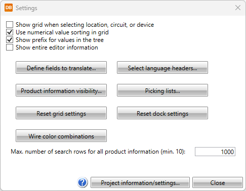 - Show grid when selecting location, circuit, or device – Select this if you want to show the grid view instead of the tree view when selecting location, circuit or device. See Select location, circuit, or device.