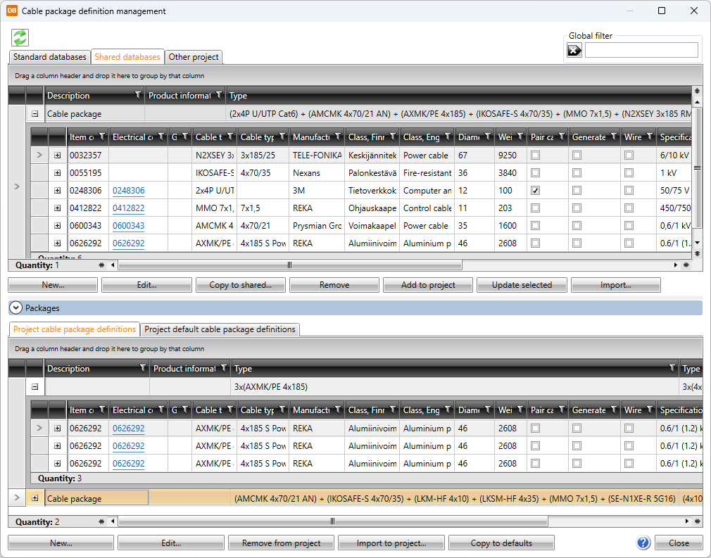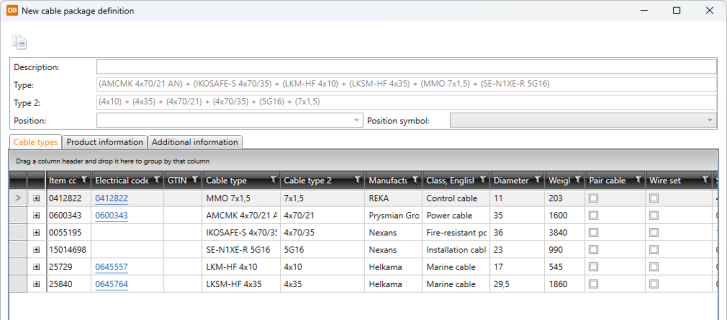 With cable packages, you can combine multiple cables to a single wiring line. A cable package holds data about included cable types and optionally product information and additional information.