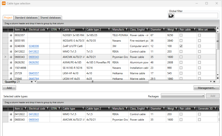 - Select cable types by double-clicking the desired row in the upper grid, or by selecting the desired rows and clicking Add.