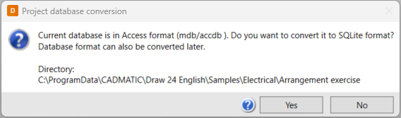 Click Yes. The SQLite project is created, and a backup of the MDB project will be saved into the bak folder (by default C:\ProgramData\CADMATIC\Draw [version] English\Electrical\Data).
