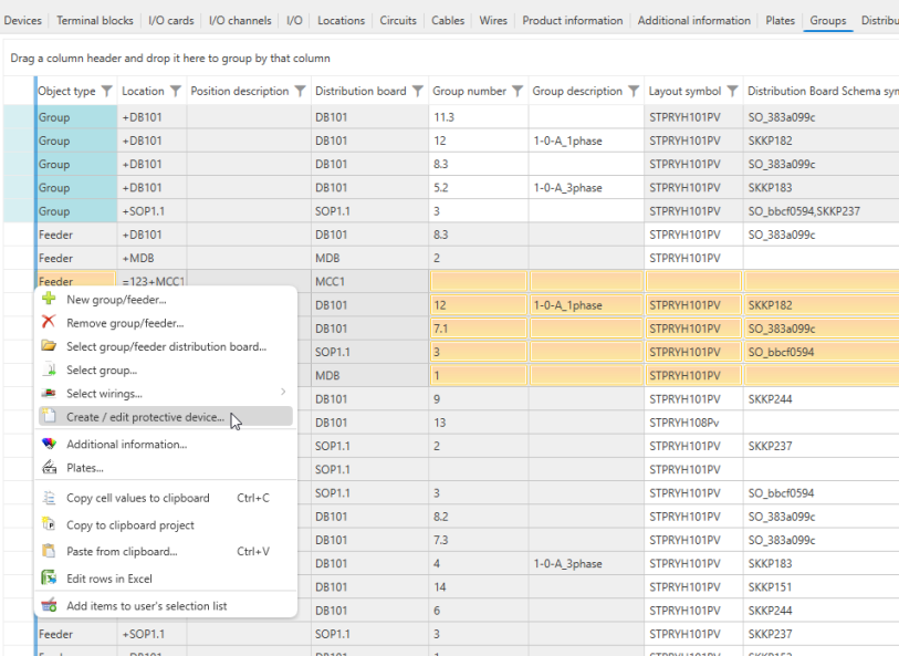 On the Groups tab, you can select several group feeders for which you want to create the same protective device. If you select feeders that already have a protective device, they are edited according to your definitions.
