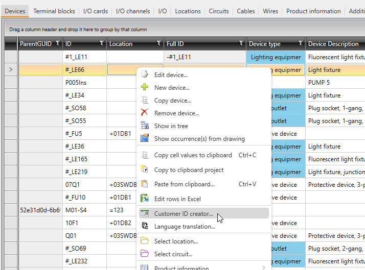 Right-click in the grid or the project tree, and select Customer ID creator.
