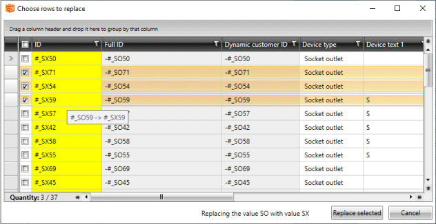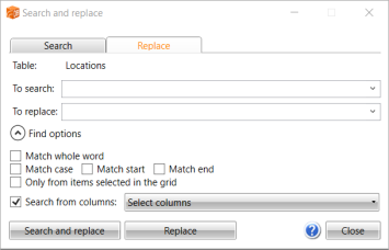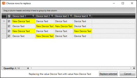 On the Replace tab, Replace replaces the next value that is found according to the search criteria. Search and replace searches for the values matching the criteria and opens the Choose rows to replace dialog. The values that are about to be replaced are highlighted with yellow. When you hover over a highlighted cell, you see the original value and the value that is going to replace it.