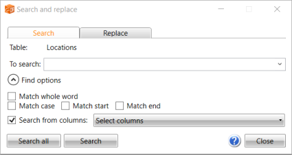 On the Search tab, Search all searches for and shows only the rows that match the criteria. Search searches for the next value matching the criteria.