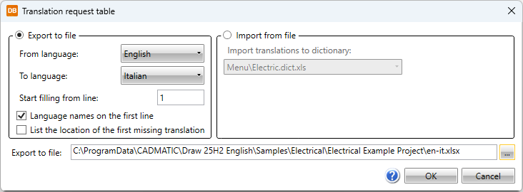 After the texts in the file have been translated, start the function again. Select Import from file and then select the dictionary to which you want to add the translations. Dictionaries are defined in project settings.