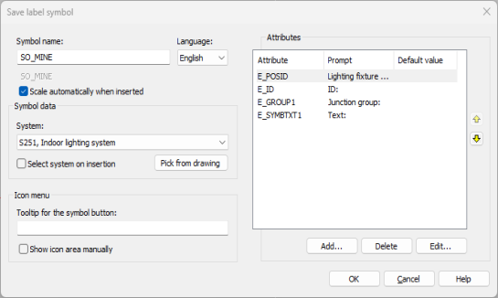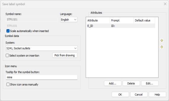- Add – Every symbol needs at least the E_ID attribute (ID). Select the desired attribute and insert default value if needed. Click OK and indicate the insertion point.