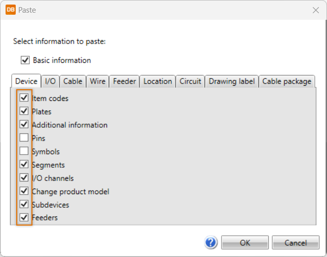 After clicking Settings, the Paste dialog opens. By default, all information is selected to be copied. Click the check boxes for the information you do not want to be selected by default when copying objects.