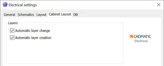 In the Electrical settings dialog, you can define the settings for the Cabinet Layout toolset on the Cabinet Layout tab. The settings are saved in the scads.ini file in the CADMATIC directory.